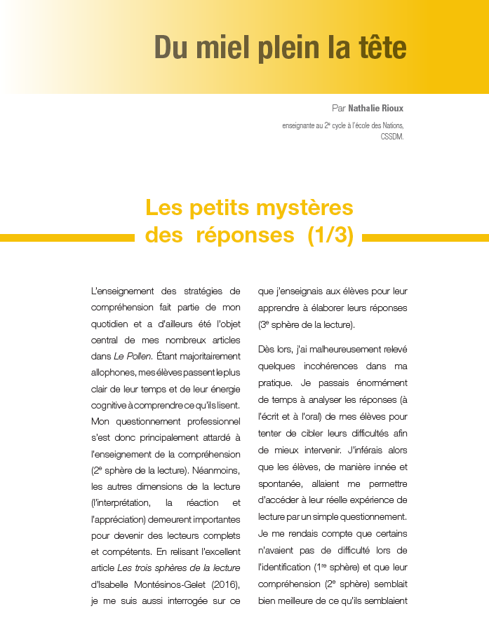 La séquence d’apprentissage proposée ici permettra de travailler explicitement l’élaboration de réponses en lien avec les quatre dimensions de la lecture. D’une durée de cinq semaines, à raison de deux ou trois périodes par semaine, plusieurs dispositifs de lecture et de minileçons seront mis de l’avant.