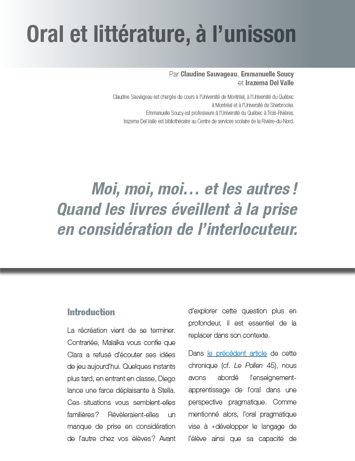 Cet article se penche sur la prise en considération de l’interlocuteur, un savoir ancré dans une perspective pragmatique de l’oral. À cette fin, nous avons recensé plusieurs albums jeunesse qui mettent en scène des exemples ou des contrexemples de ce savoir à travers leur récit et la manière dont les personnages communiquent entre eux. Enfin, nous proposons une minileçon basée sur l’un de ces albums afin d’exemplifier l’enseignement-apprentissage de ce savoir.