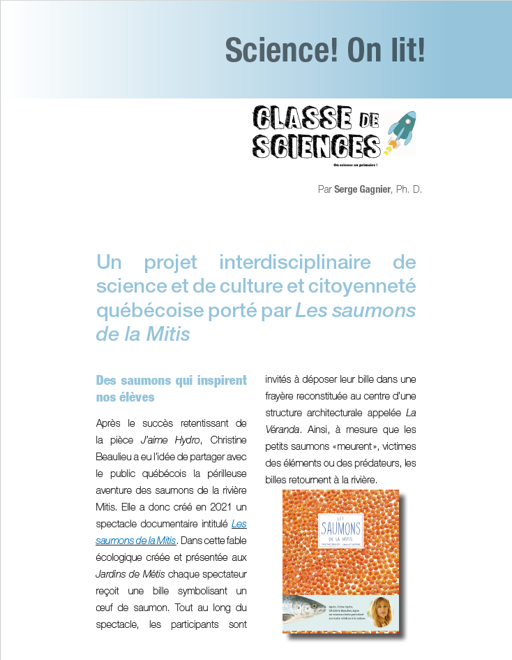 Des 8000 œufs qu’une femelle dépose dans le lit de la rivière, seuls quatre saumons survivent en moyenne et reviennent se reproduire dans leur rivière de naissance après avoir passé quelques années dans la mer du Labrador. En 2023, Christine Beaulieu publie le livre Les Saumons de la Mitis magnifiquement illustré par Caroline Lavergne. C’est cet album qui a donné l’idée à une enseignante de quatrième année de mon école de faire vivre cet évènement à nos élèves.