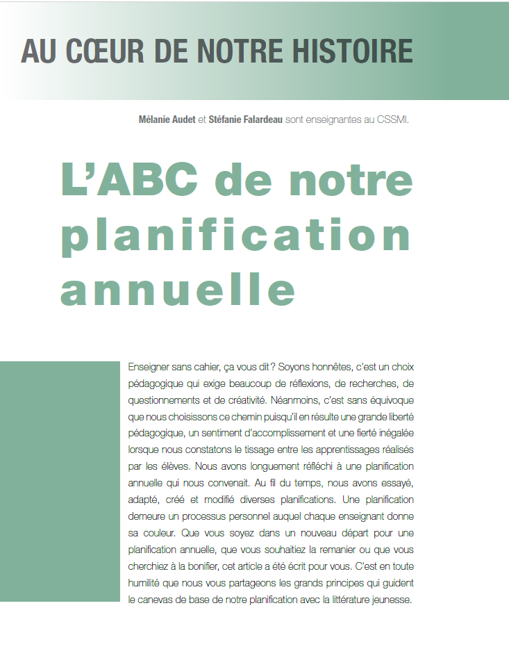 Enseigner sans cahier, ça vous dit?? Soyons honnêtes, c’est un choix pédagogique qui exige beaucoup de réflexions, de recherches, de questionnements et de créativité. Néanmoins, c’est sans équivoque que nous choisissons ce chemin puisqu’il en résulte une grande liberté pédagogique, un sentiment d’accomplissement et une fierté inégalée lorsque nous constatons le tissage entre les apprentissages réalisés par les élèves. Nous avons longuement réfléchi à une planification annuelle qui nous convenait. Au fil du temps, nous avons essayé, adapté, créé et modifié diverses planifications. Une planification demeure un processus personnel auquel chaque enseignant donne sa couleur. Que vous soyez dans un nouveau départ pour une planification annuelle, que vous souhaitiez la remanier ou que vous cherchiez à la bonifier, cet article a été écrit pour vous. C’est en toute humilité que nous vous partageons les grands principes qui guident le canevas de base de notre planification avec la littérature jeunesse.