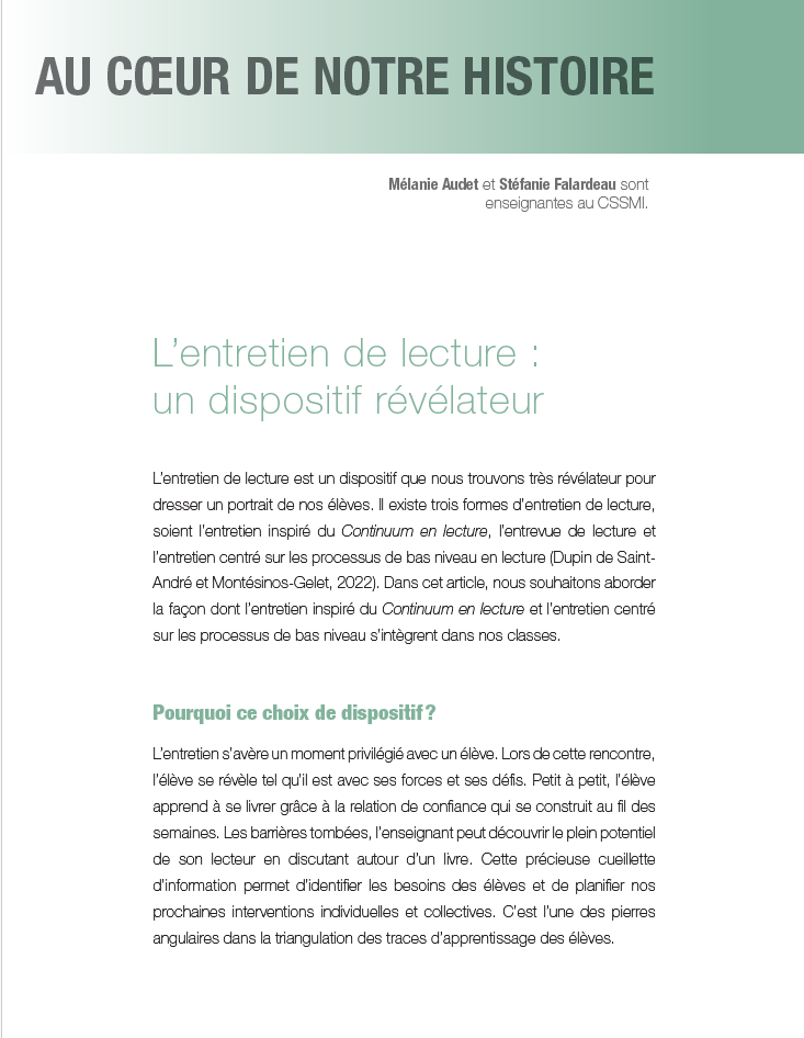 L’entretien de lecture est un dispositif que nous trouvons très révélateur pour dresser un portrait de nos élèves. Il existe trois formes d’entretien de lecture, soient l’entretien inspiré du Continuum en lecture, l’entrevue de lecture et l’entretien centré sur les processus de bas niveau en lecture (Dupin de Saint-André et Montésinos-Gelet, 2022). Dans cet article, nous souhaitons aborder la façon dont l’entretien inspiré du Continuum en lecture et l’entretien centré sur les processus de bas niveau s’intègrent dans nos classes.
