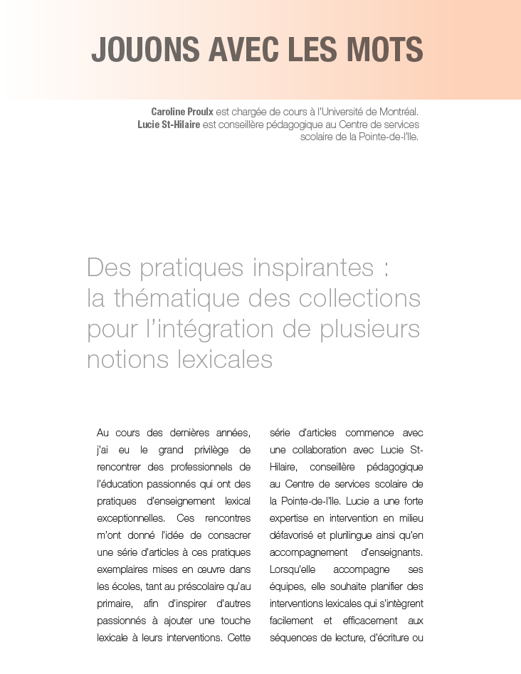 Au cours des dernières années, j’ai eu le grand privilège de rencontrer des professionnels de l’éducation passionnés qui ont des pratiques d’enseignement lexical exceptionnelles. Ces rencontres m’ont donné l’idée de consacrer une série d’articles à ces pratiques exemplaires mises en œuvre dans les écoles, tant au préscolaire qu’au primaire, afin d’inspirer d’autres passionnés à ajouter une touche lexicale à leurs interventions. Cette série d’articles commence avec une collaboration avec Lucie St-Hilaire, conseillère pédagogique au Centre de services scolaire de la Pointe-de-l’Ile. Lucie a une forte expertise en intervention en milieu défavorisé et plurilingue ainsi qu’en accompagnement d’enseignant. Lorsqu’elle accompagne ses équipes, elle souhaite planifier des interventions lexicales qui s’intègrent facilement et efficacement aux séquences de lecture, d’écriture ou de communication orale. Cet article présente les activités lexicales mises en œuvre dans des classes de 3e cycle autour du thème des collections. Cette thématique faisait partie d’une séquence plus large consacrée au développement identitaire des élèves abordant la famille, les langues et les rêves.